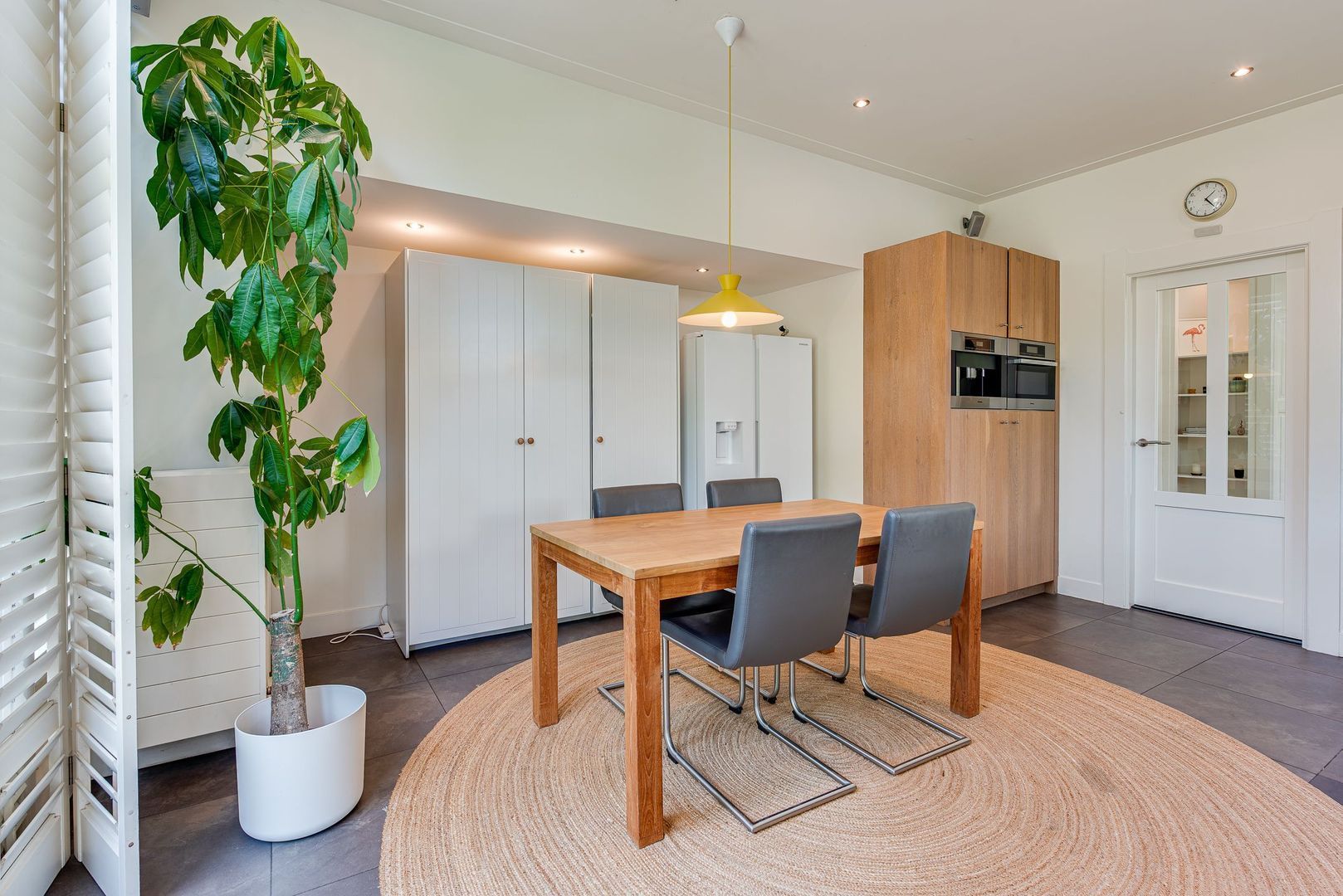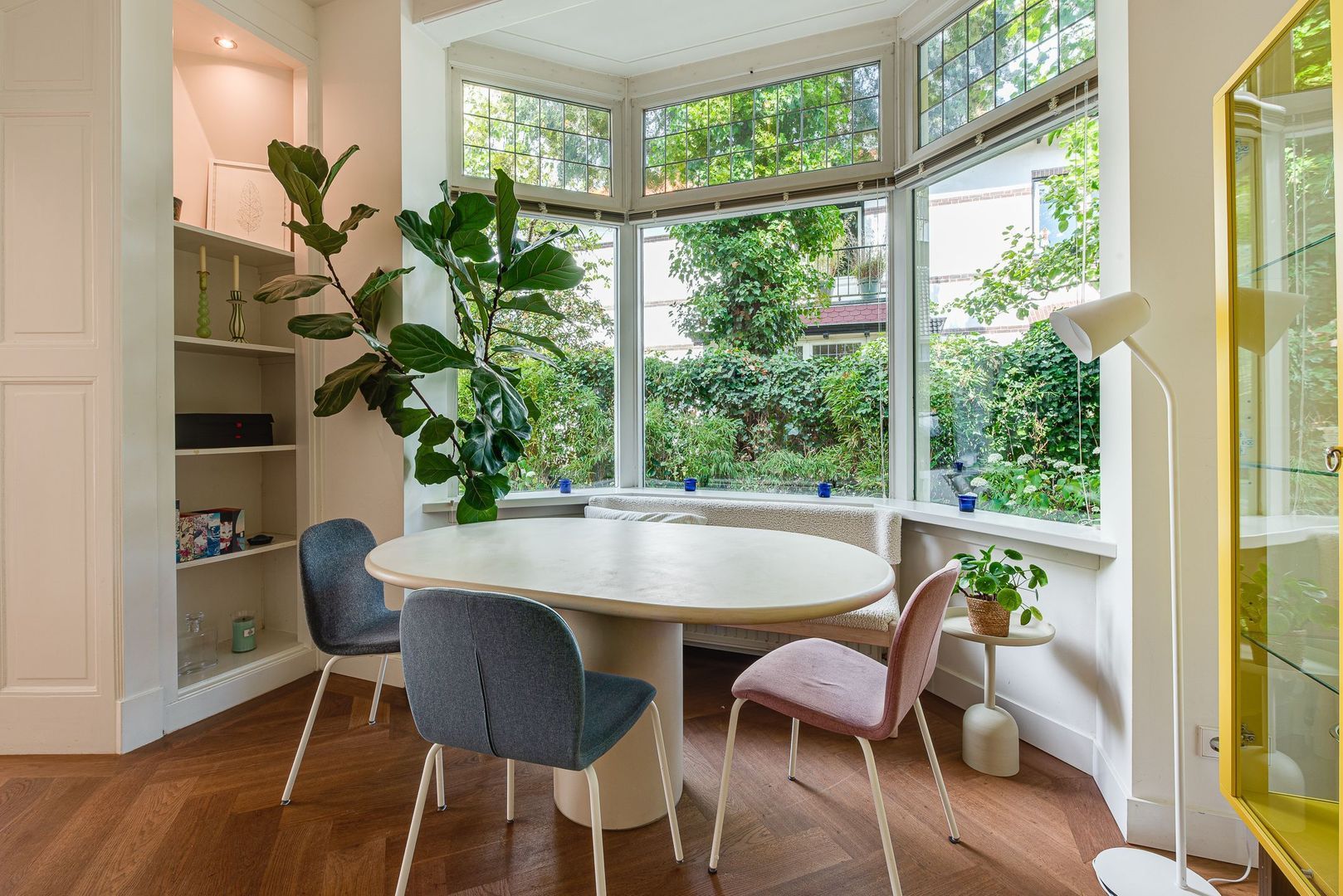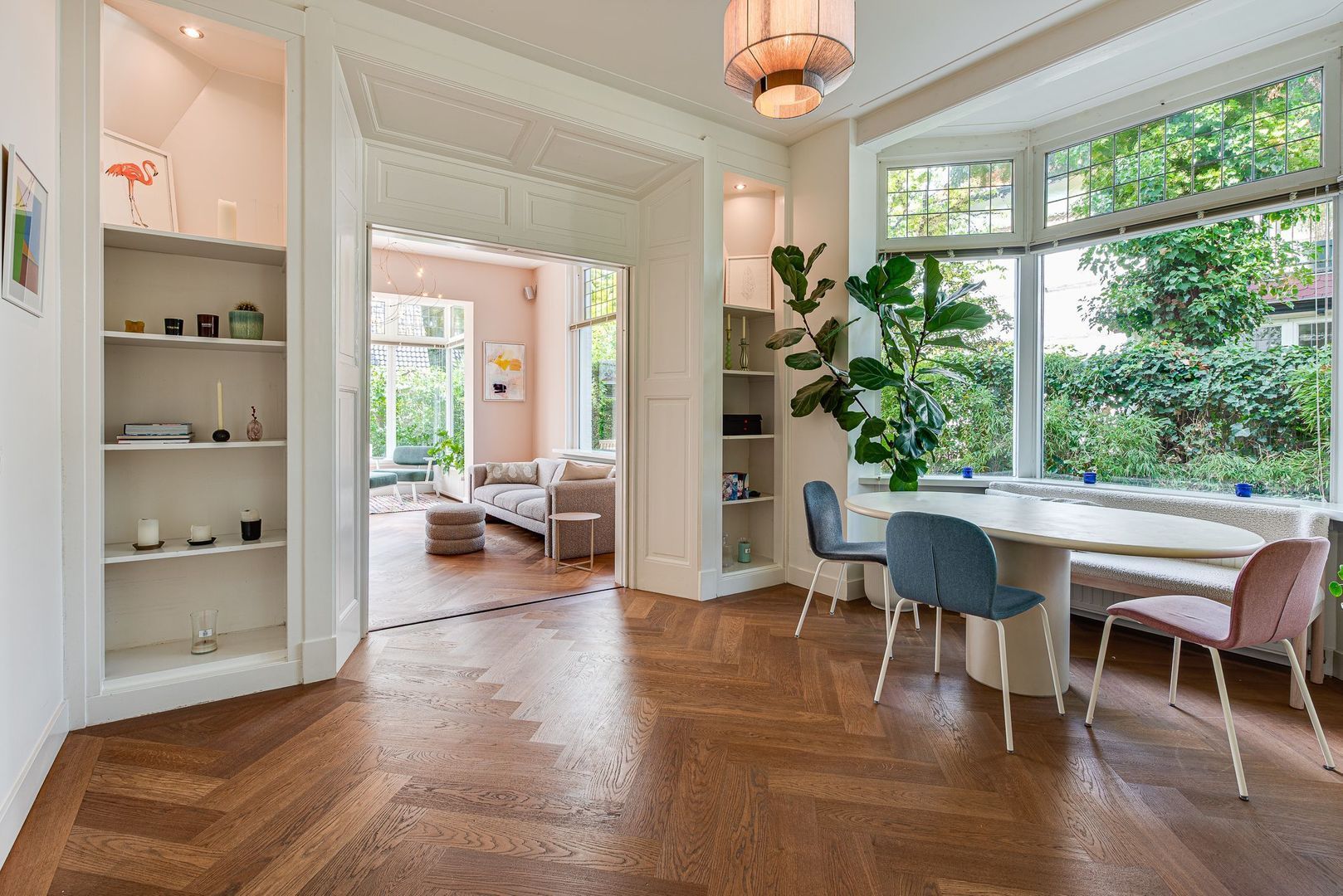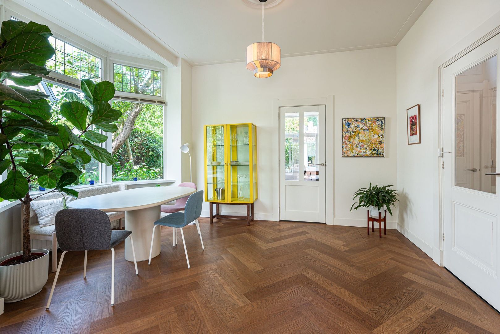 Entree, ruime hal met Portugese tegelvloer, m.k., modern toilet v.v. wandcloset en fontein, stahoge kelder v.v. koekoek met aansluiting wasmachine/droger, ruime woonkamer met hoekkast, serre, eiken parket, gashaard (Faber) v.v. warmte-circulatie, en-suitedeuren v.v. glas-in-lood naar eetkamer met suitekasten, erker en eiken parket, moderne, sfeervolle, eiken keuken v.v. vloerverwarming, shutters (Alno), natuurstenen werkblad, 90-cm breed 9-pits-fornuis v.v elektrische oven, RVS-afzuigschouw, inbouw koffiemachine (Miele), vaatwasser, combi magnetron/oven/grill en energiezuinige boiler (2025).