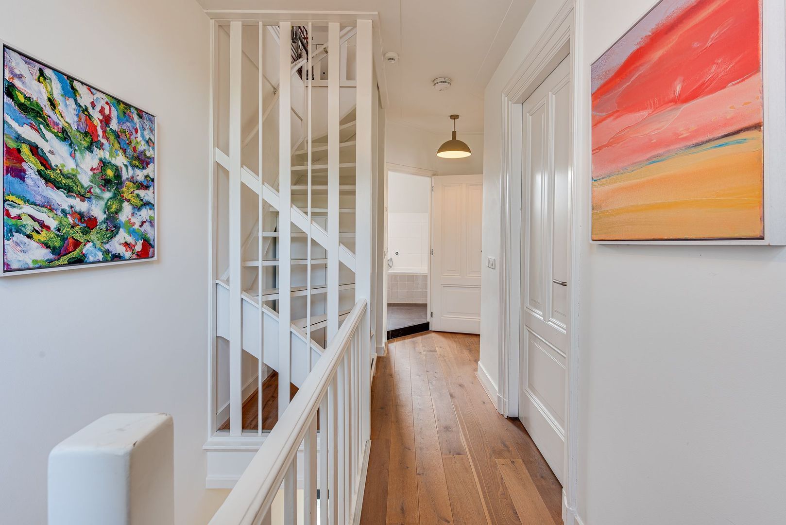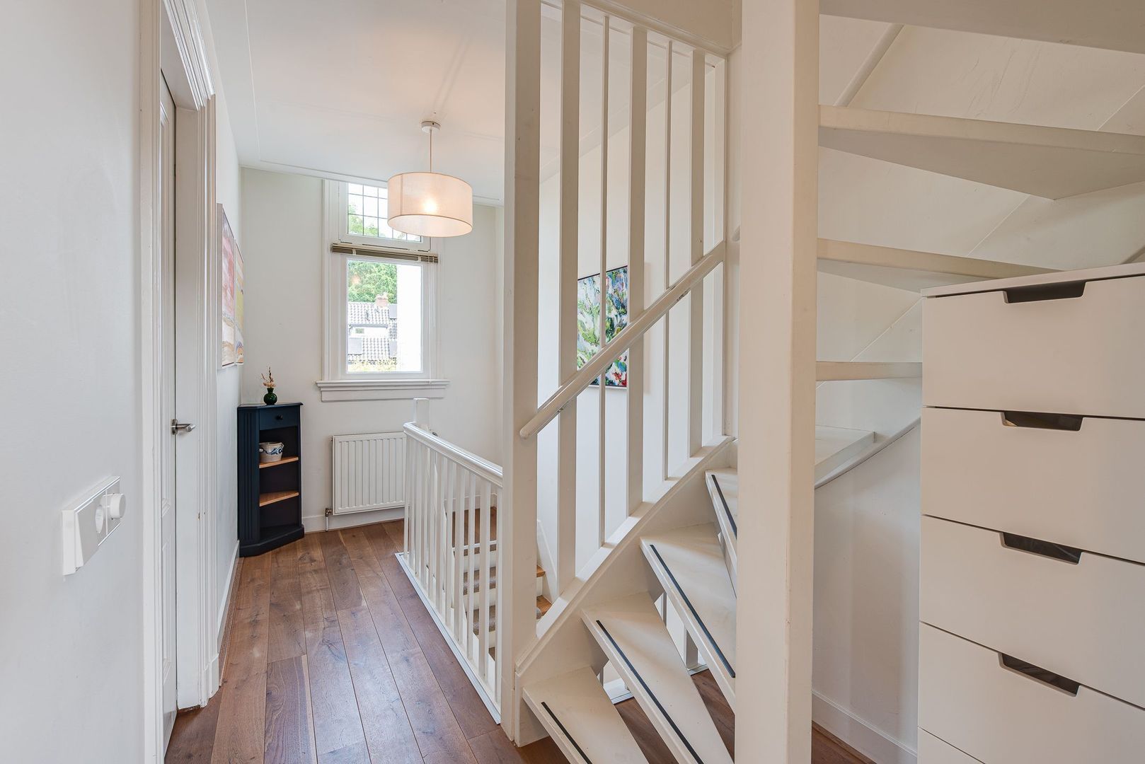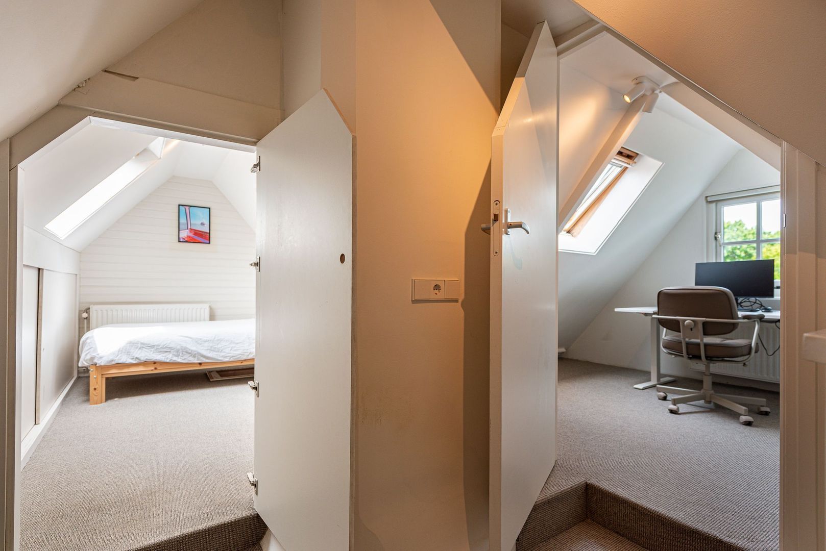 Overloop, opstelling gas-c.v.-wandketel, (HR, 2019) en MV-box, 3e slaapkamer met dakraam en raam in topgevel, 4e slaapkamer met 2 dakramen.