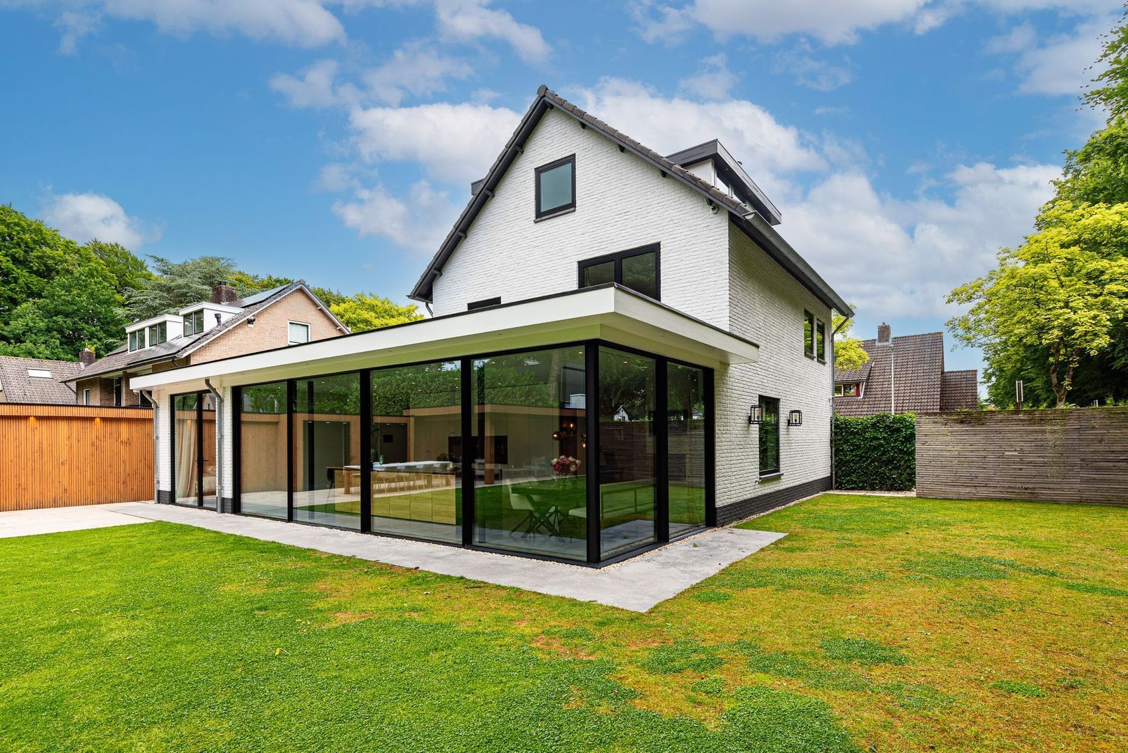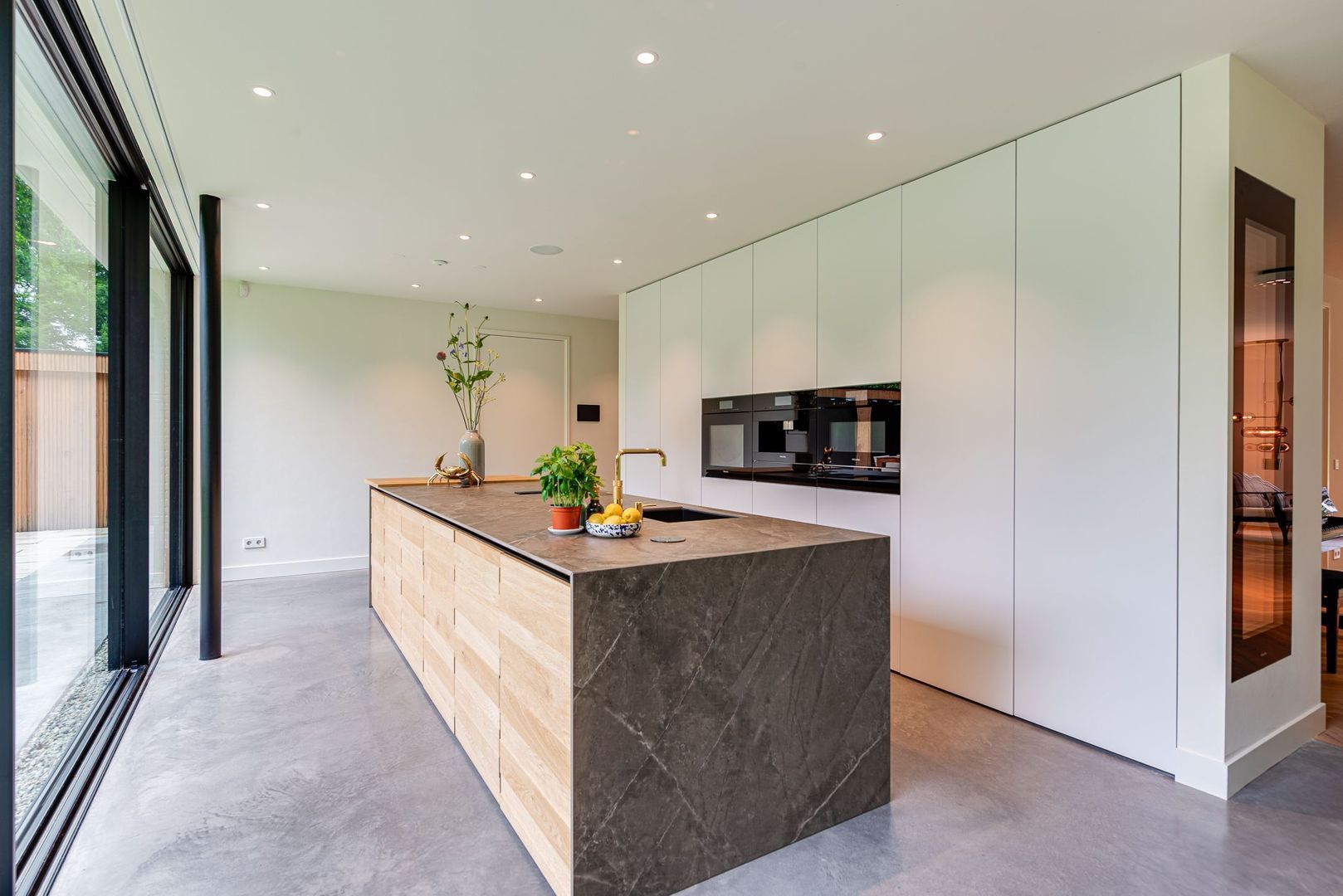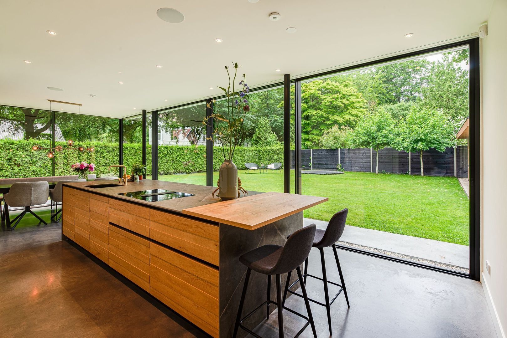 - royale woonkeuken met glazen schuifwanden naar de tuin