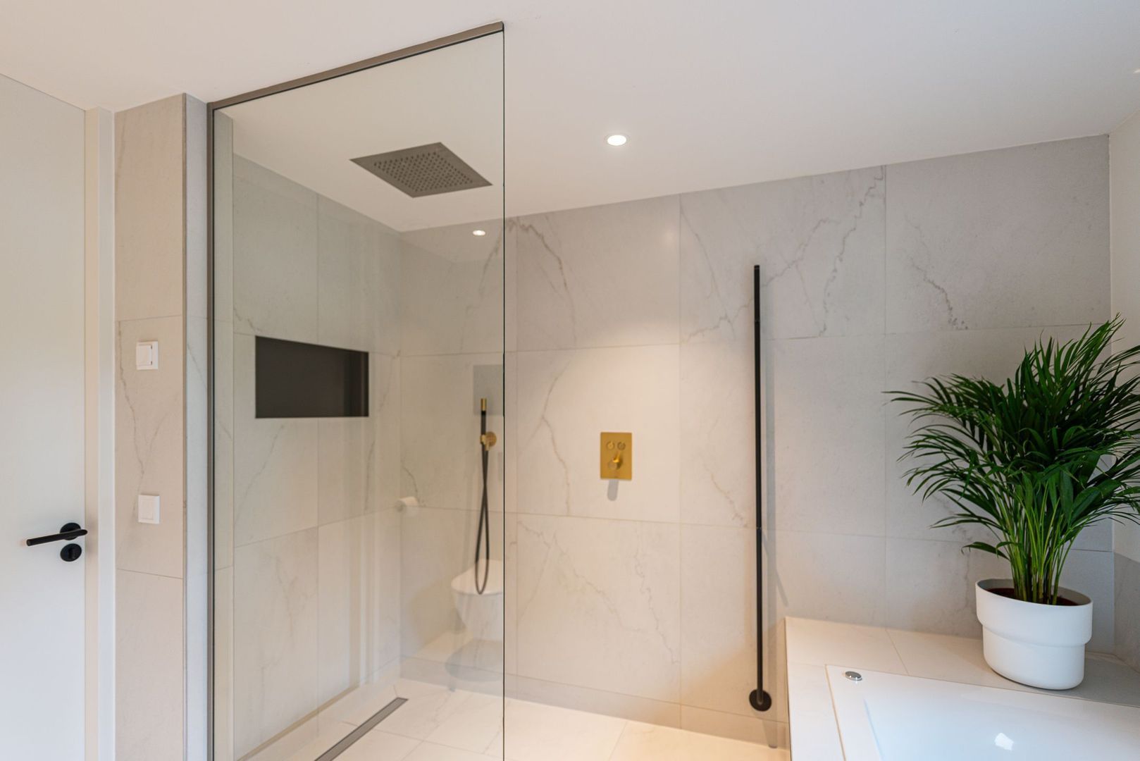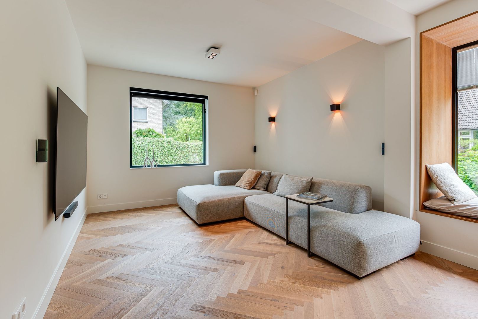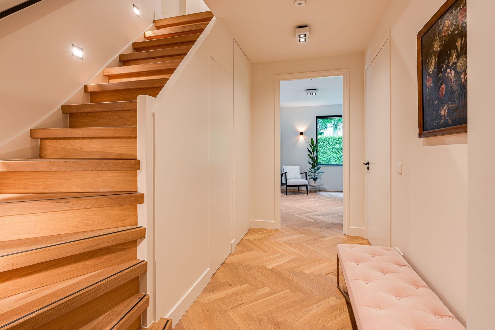 Lichte overloop met visgraat parketvloer. Royale hoofdslaapkamer met airconditioning, hotelschakeling en openslaande deuren naar het dak van de aanbouw. De tweede slaapkamer is bijzonder ruim, terwijl de derde slaapkamer zich onderscheidt door de aangename lichtinval. Luxe badkamer met dubbele wastafel, whirlpool bad, toilet, designradiator en inloop-regendouche.