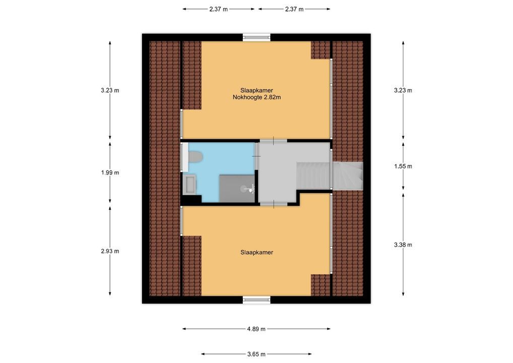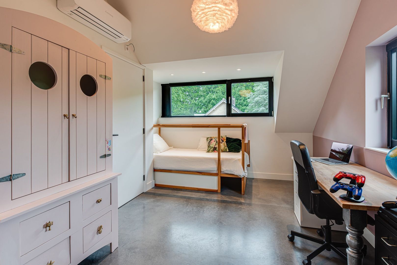 Overloop met stijlvolle gevlinderde betonvloer. Vierde slaapkamer aan de voorzijde met dakkapel, airconditioning en praktische bergruimte. Derde luxe badkamer met sfeervolle, zichtbare balken, voorzien van inloopdouche, toilet, wastafelmeubel en designradiator. Ruime vijfde slaapkamer aan de achterzijde met dakkapel, airconditioning en extra bergruimte.