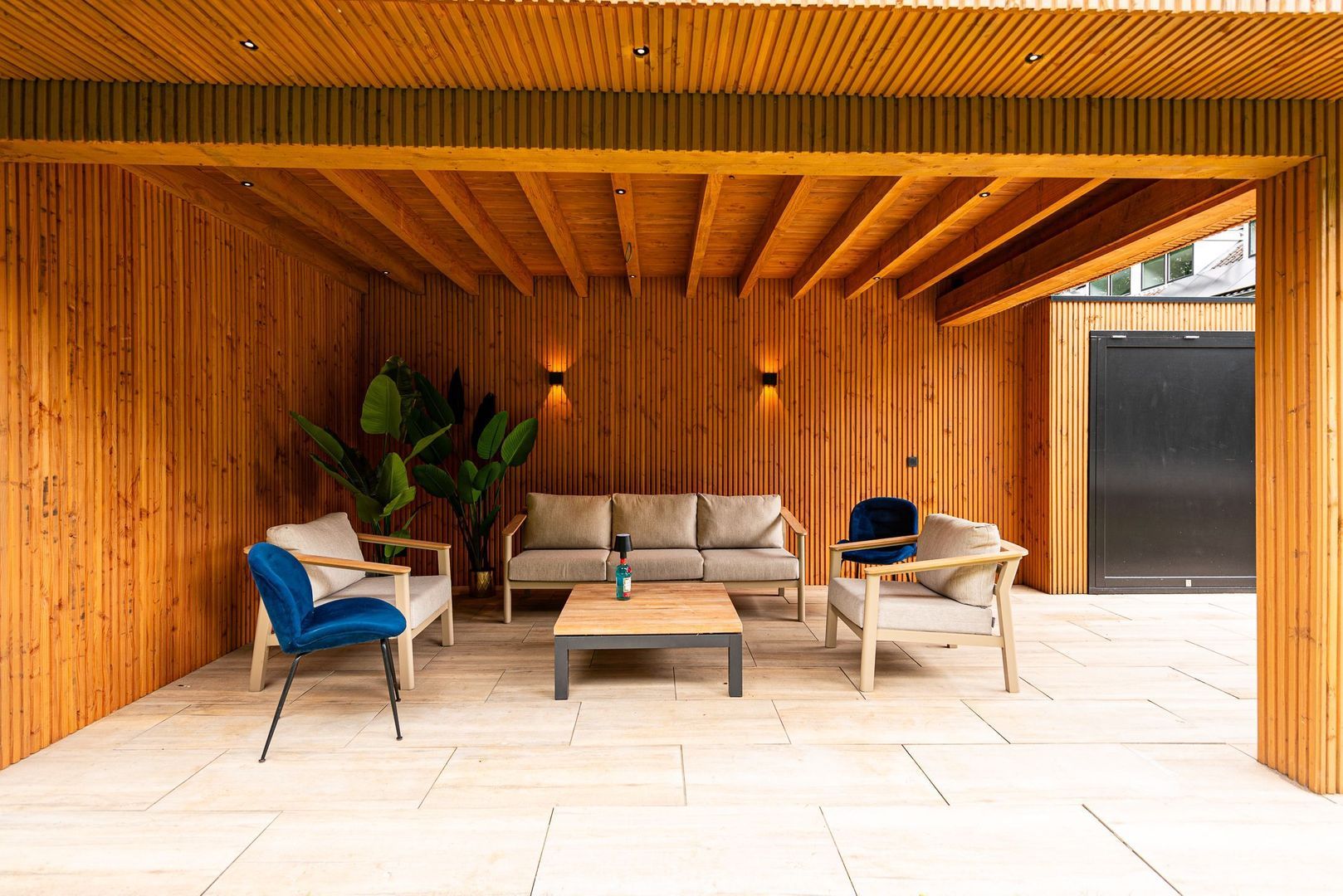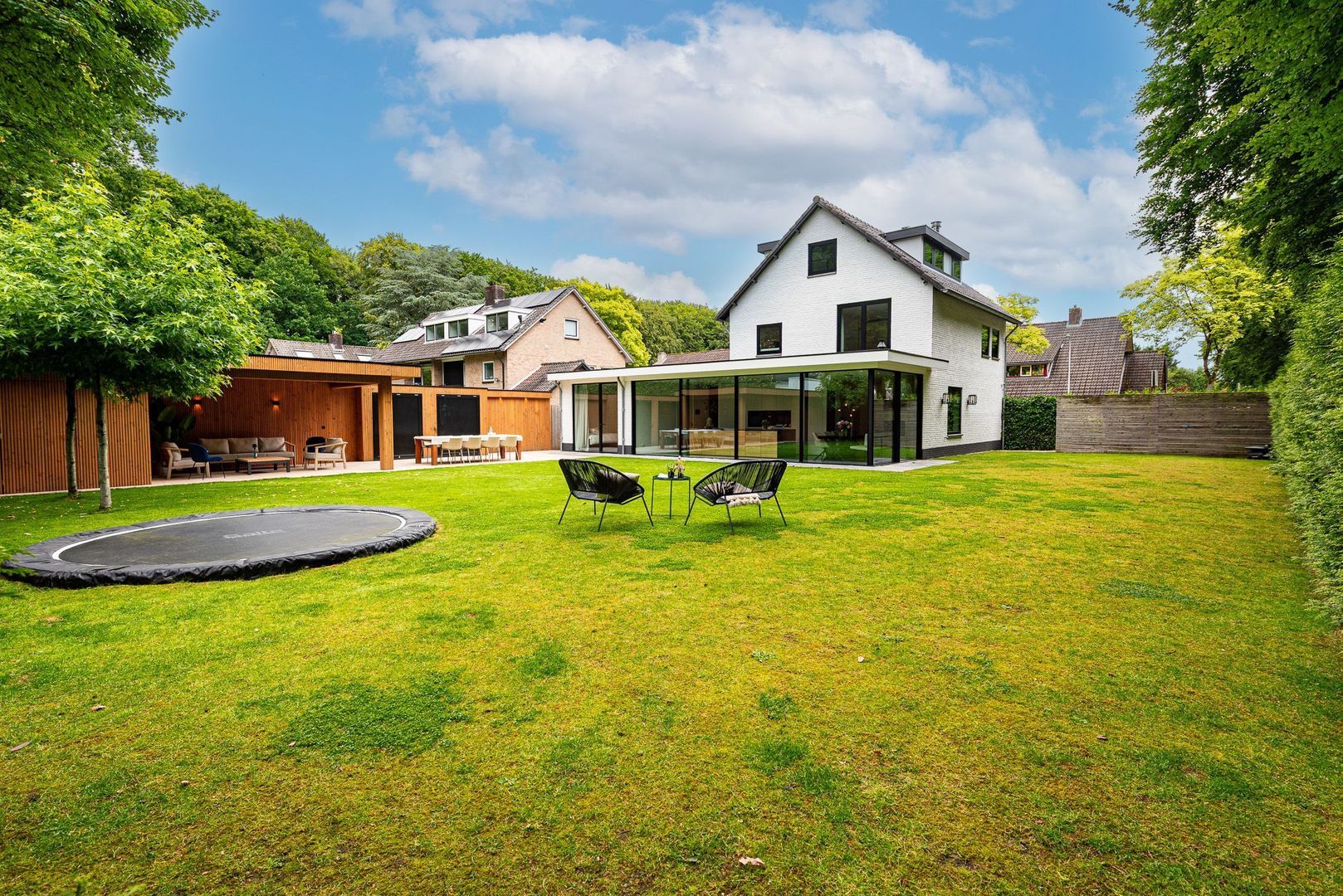 De zonnige achtertuin biedt maximale privacy, vrij uitzicht op prachtige bomen en veel groen. Er is een sfeervolle, overkapte veranda met luxe buitenkeuken, geïntegreerde verlichting, een ruim betegeld zonneterras en een praktische tuinschuur. Aan de zijkant van het huis bevindt zich een mooie, ruime plek voor fietsen. De brede oprit aan de voorzijde biedt ruimte voor meerdere auto’s. De villa is rondom voorzien van beveiligingscamera’s.