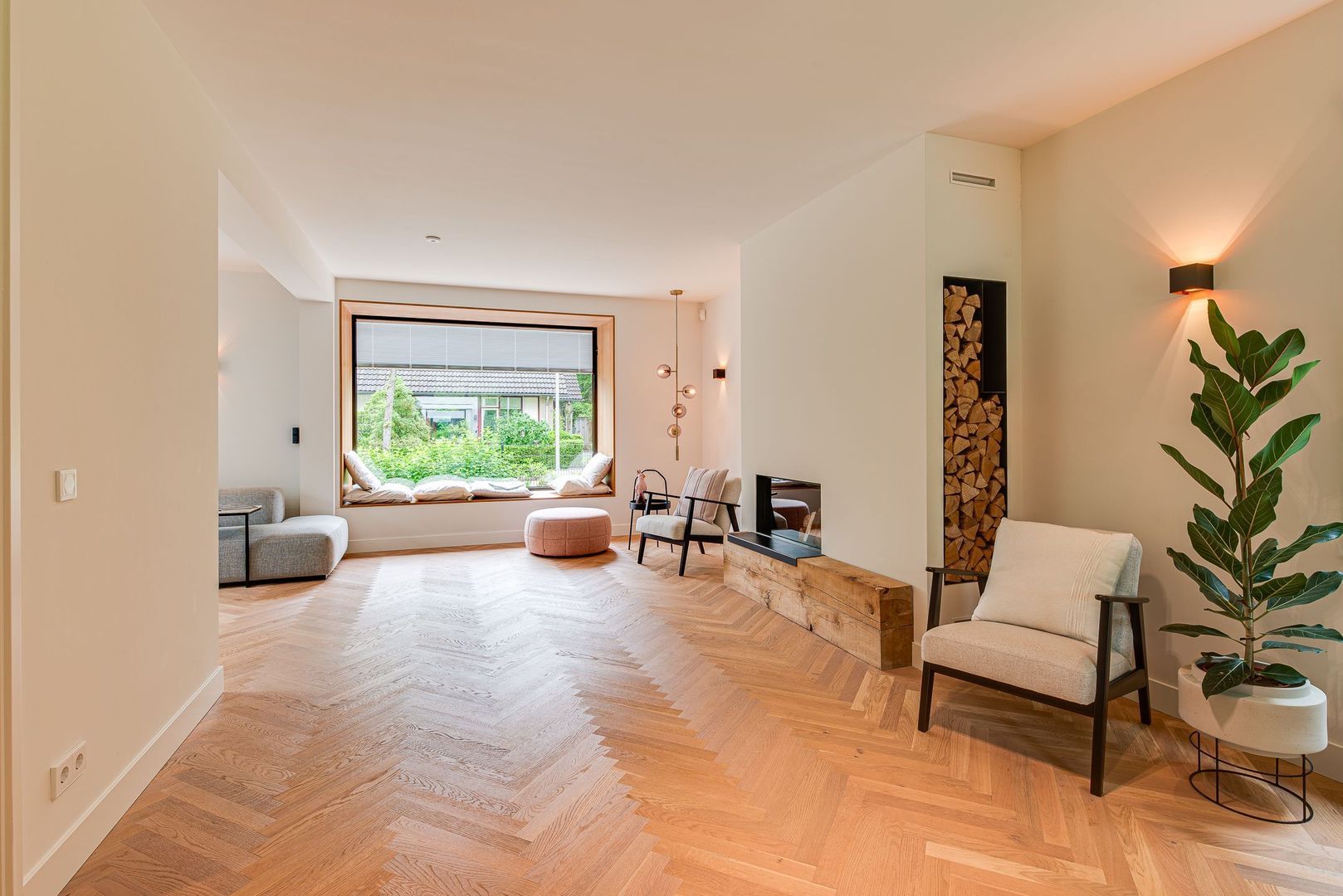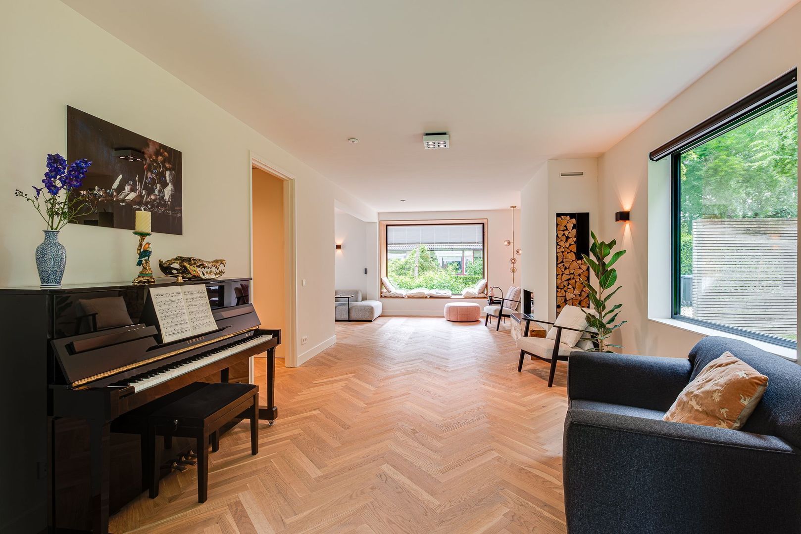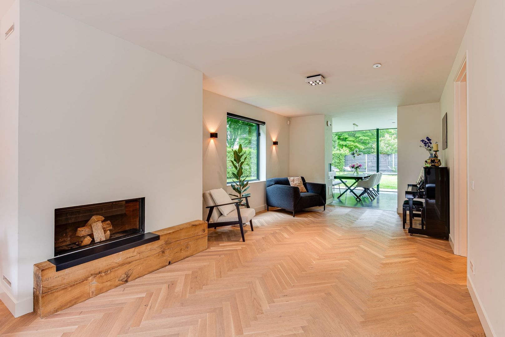 Statige entreehal met toegang tot ruime, stahoogte kelder, prachtige trapopgang voorzien van eiken treden, antislip-strips, trapverlichting en stalen leuningen. Ruim toilet met fonteintje, toegang tot de lichte, L-vormige woonkamer met visgraat parketvloer, sfeervolle hoog rendement open haard met royale schouw, zitvensterbank met inblinds en wandverlichting. Aan de achterzijde een royale woonkeuken met luxe gevlinderde betonvloer, sfeervolle eethoek met gashaard en een hoogwaardige keuken met kookeiland en uitgebreide luxe Miele inbouwapparatuur, waaronder warmhoudlades en klimaatkast. Grote glazen wanden aan de tuinzijde zijn volledig te openen, waardoor een prachtige verbinding ontstaat tussen binnen en buiten. Vanuit de keuken is er toegang tot een praktische bijkeuken/wasruimte en de garage.